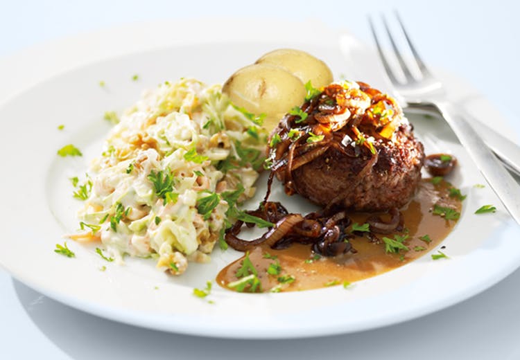 Hakkebøf med bløde løg, kartofler, sovs og surt samt æblekage / kaffe til 145 kr.